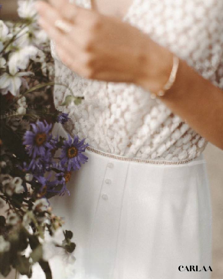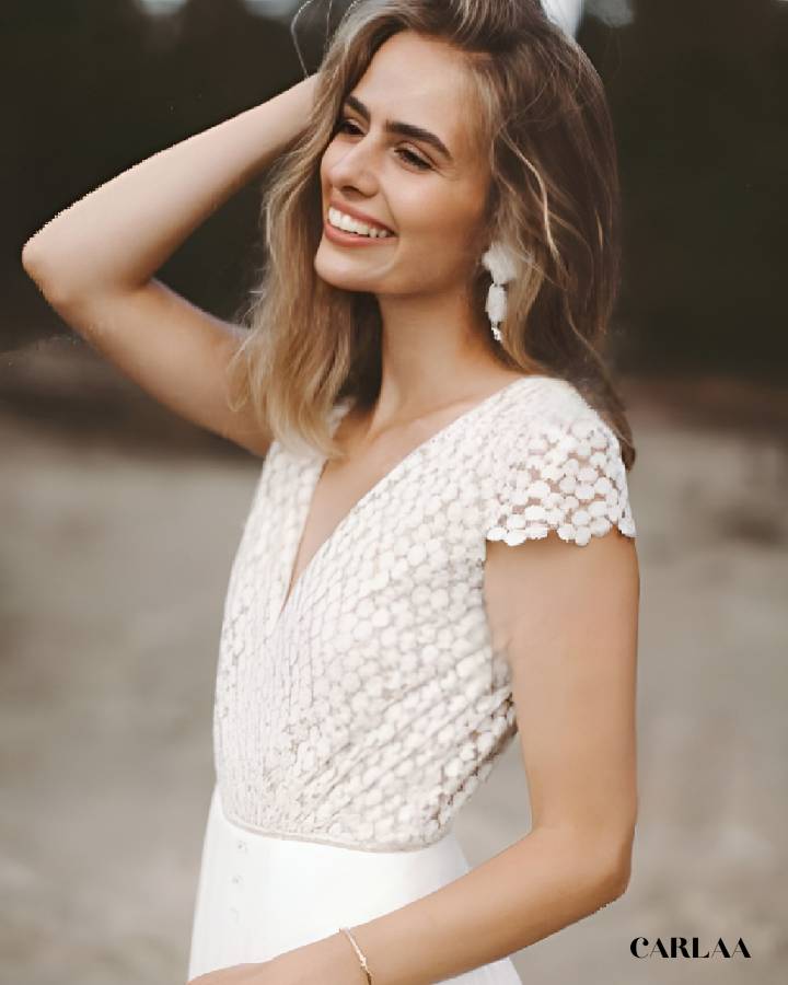 Dieser elegante Jumpsuit ist die perfekte Alternative zum klassischen Brautkleid für Bräute, die einen freien, unkonventionellen Look suchen. Mit tiefem V-Ausschnitt, zarter Spitze im Oberteil, leicht angeschnittenen Ärmeln und weitem Hosenbein strahlt er pure Eleganz und Leichtigkeit aus. Der offene Rücken sorgt für einen femininen Hingucker, während die fließende Silhouette jede Figur umschmeichelt. Ideal für eine Sommerhochzeit, Strandhochzeit oder eine entspannte Boho-Zeremonie im Freien. Dieser Jumpsuit verbindet Komfort und Stil – für Bräute, die ihren großen Tag in einem modernen, einzigartigen Outfit genießen möchten.