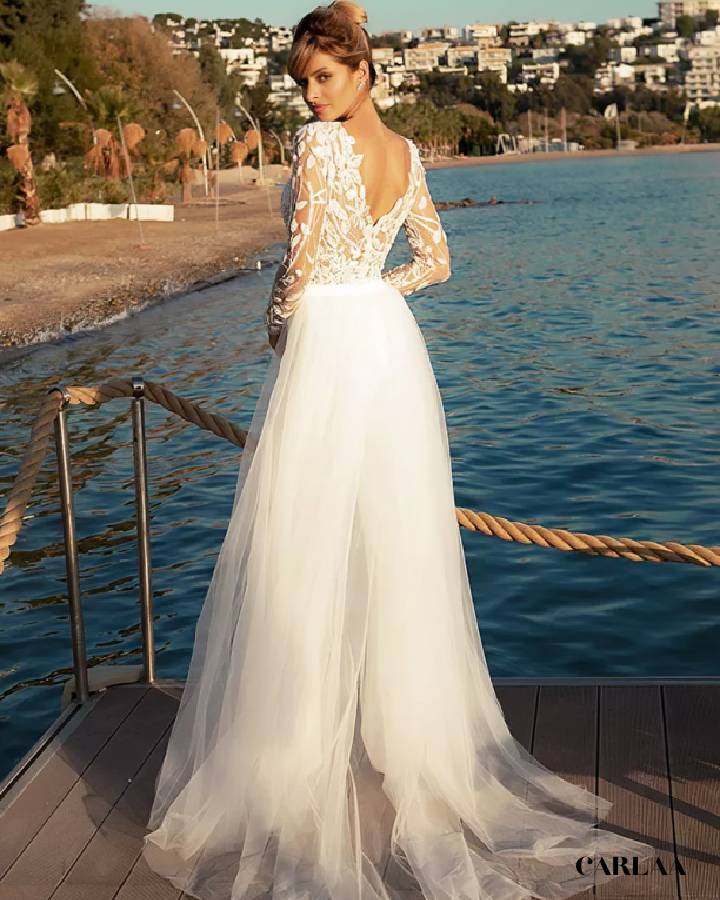 Das transparente Oberteil mit zarter Blumenspitze verleiht einen romantischen Touch, während die fließende Schleppe und die schmale Hose eine feminine Silhouette schaffen. Ideal für das Standesamt oder eine elegante Hochzeit am Meer – dieser Hochzeitsjumpsuit mit Ärmeln vereint Komfort, Raffinesse und einen Hauch von Glamour.
