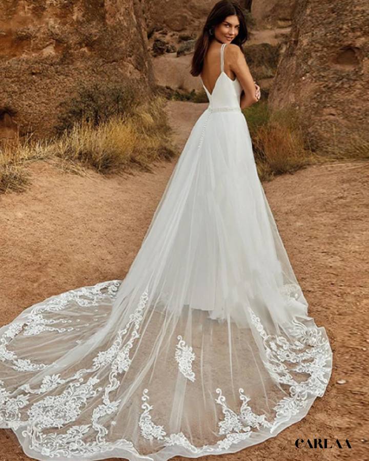 Das figurbetonte Oberteil mit tiefem V-Ausschnitt sorgt für eine feminine Silhouette, während die weite Hose Bewegungsfreiheit und Stil bietet. Die abnehmbare Schleppe aus zartem Tüll mit edler Spitze verwandelt den Jumpsuit in einen atemberaubenden Brautlook. Ideal für standesamtliche Hochzeiten, Sommerhochzeiten oder Bräute, die ein außergewöhnliches Outfit suchen.