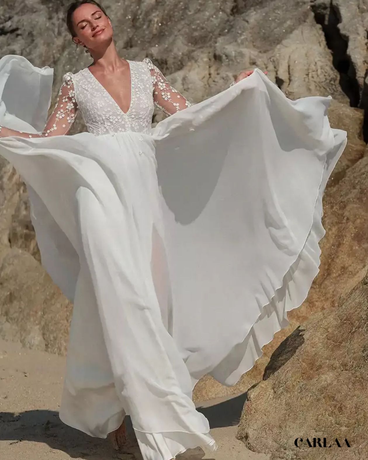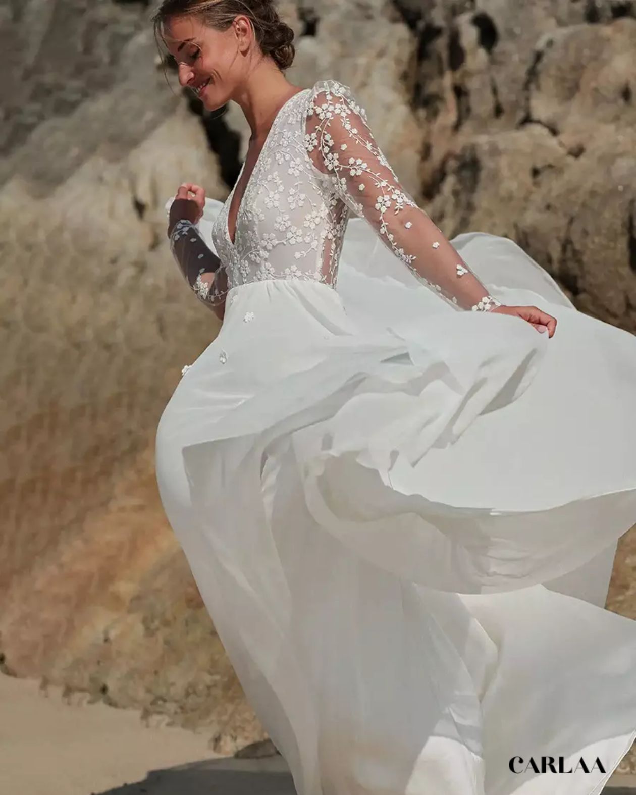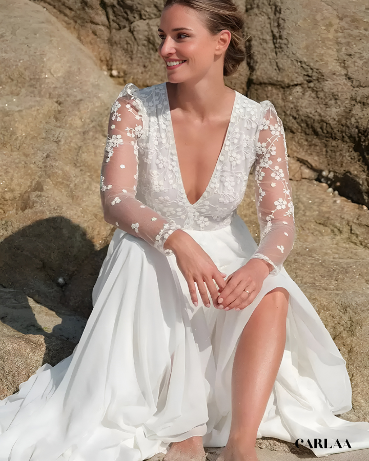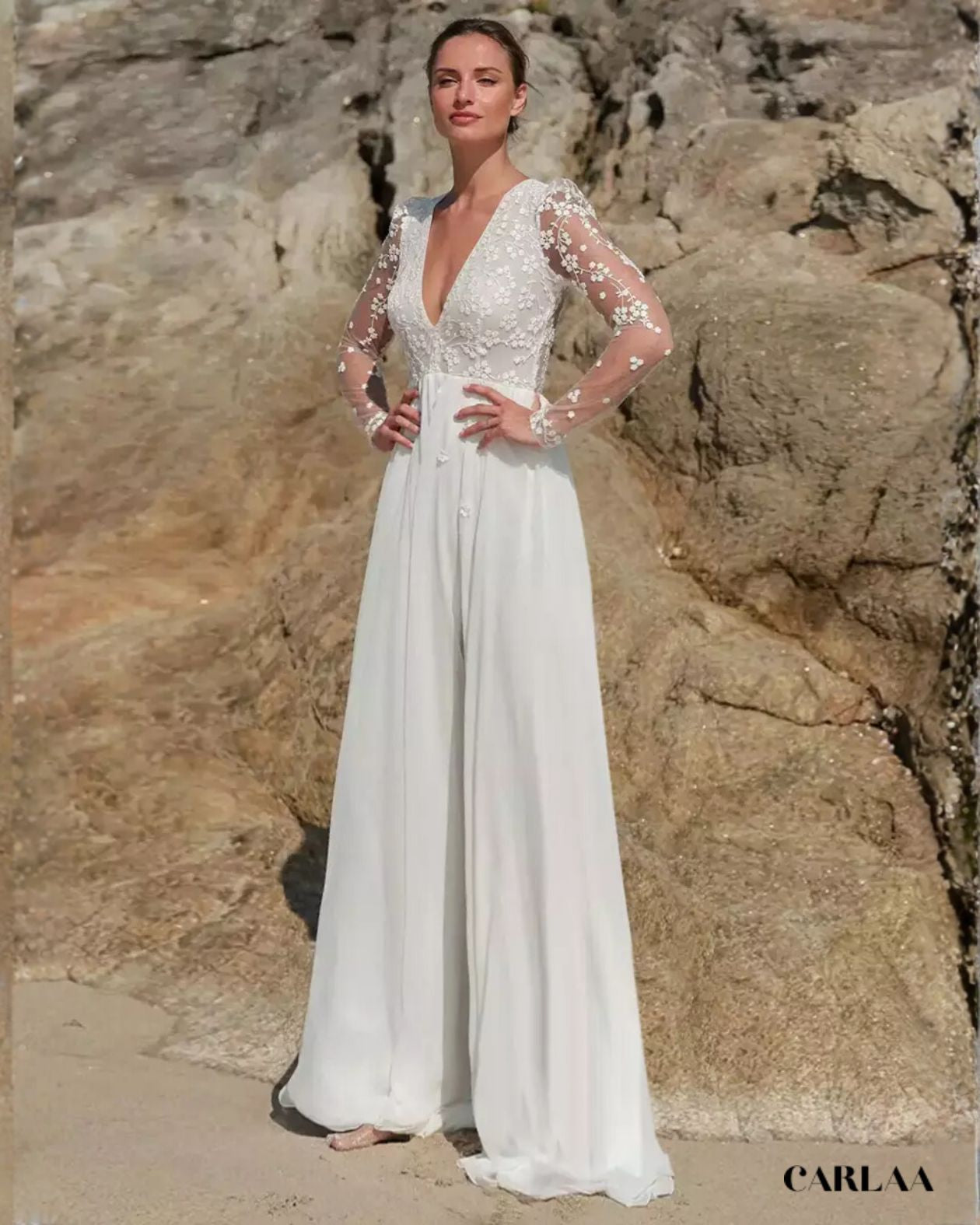 Dieser elegante Braut Jumpsuit mit Spitzenärmeln vereint moderne Brautmode mit zeitloser Romantik.