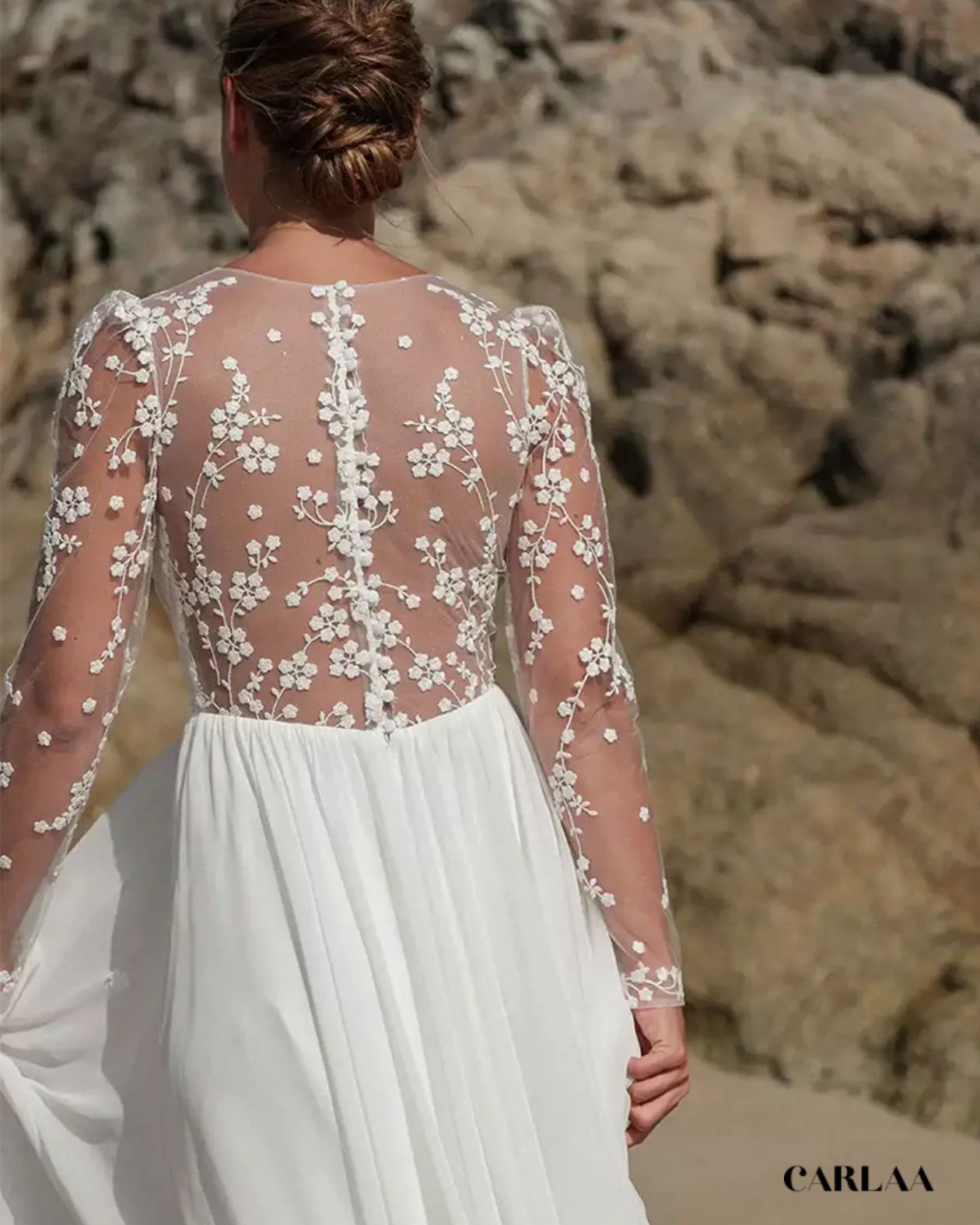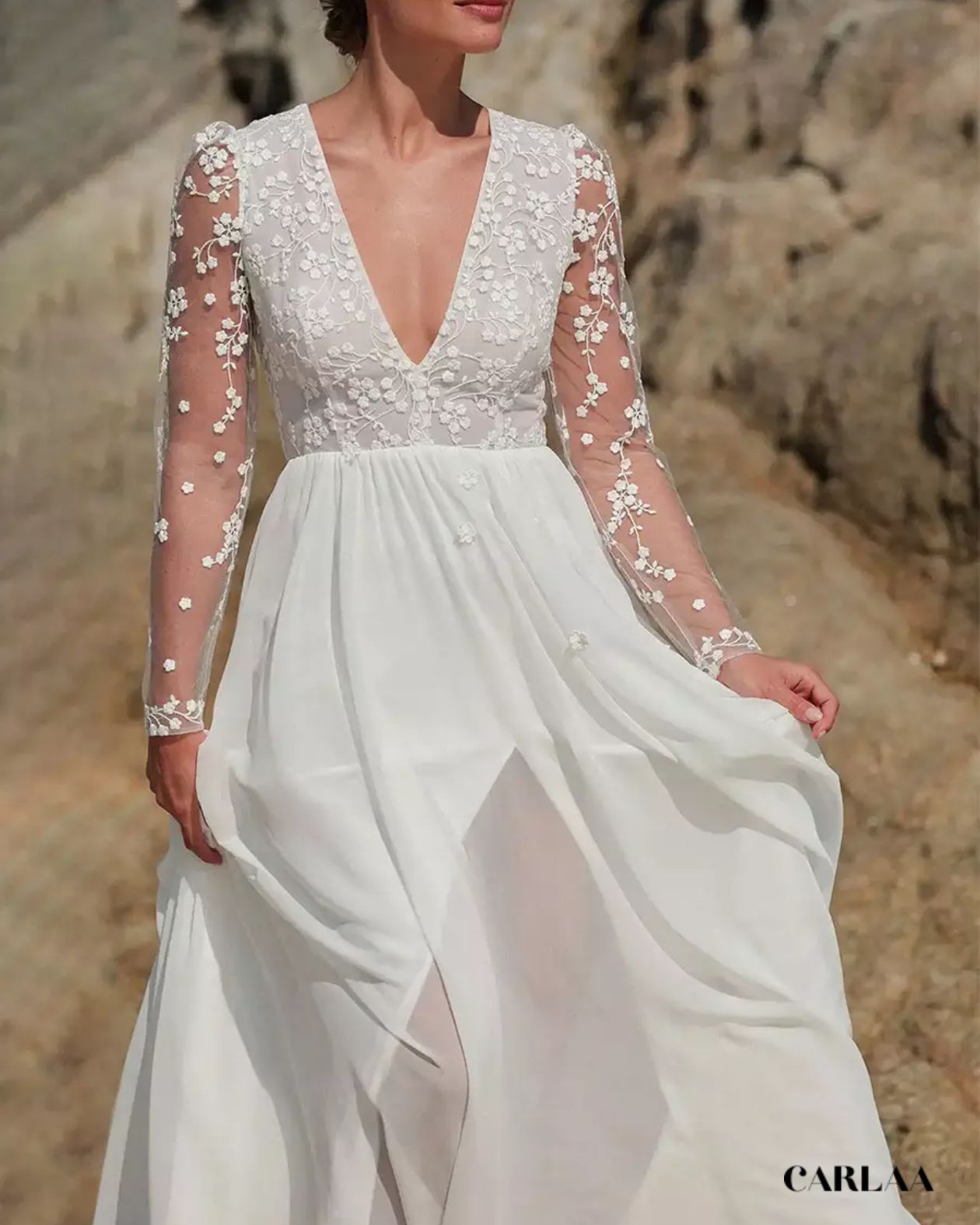 Das Oberteil ist mit zarter floraler Spitze gearbeitet, die sich über die langen, transparenten Ärmel zieht und dem Look eine leichte, feminine Ausstrahlung verleiht. Der tiefe V-Ausschnitt sorgt für eine elegante Silhouette, während die feinen Stickereien dem Design eine besondere Raffinesse geben.