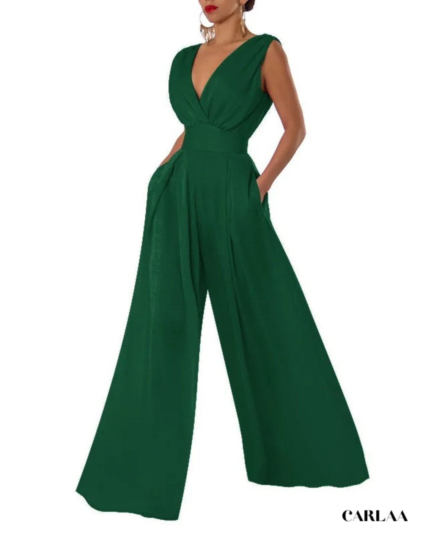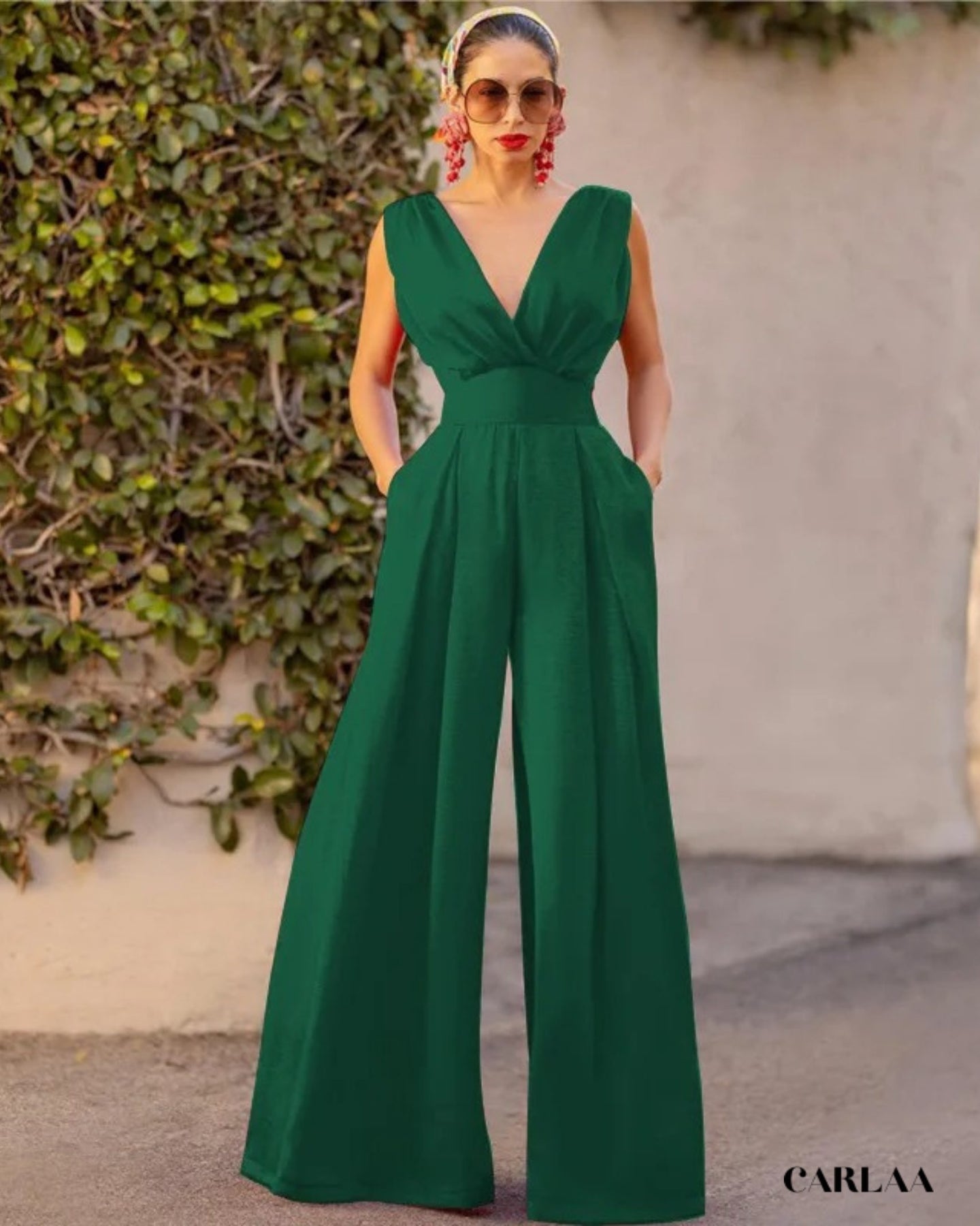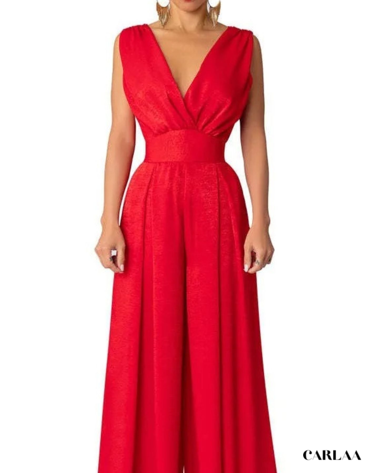 Mit diesem eleganten Jumpsuit zeigst du Stilgefühl und Selbstbewusstsein. Der fließende Stoff umspielt deine Figur, während der tiefe V-Ausschnitt und die betonte Taille deine feminine Silhouette wunderschön zur Geltung bringen. Die weiten Hosenbeine verleihen dem Look eine moderne Leichtigkeit – perfekt, wenn du dich sowohl elegant als auch bequem fühlen möchtest. Der Elegant Jumpsuit Festlich ist ideal für Hochzeiten, elegante Feiern oder einen besonderen Abend – überall dort, wo du glänzen möchtest, ohne es zu übertreiben. Kombiniere ihn mit hohen Absätzen und dezentem Schmuck, und dein Auftritt wird garantiert unvergesslich. Ein Look, der nicht nur beeindruckt, sondern dich auch strahlen lässt – ganz natürlich und mit viel Stil.