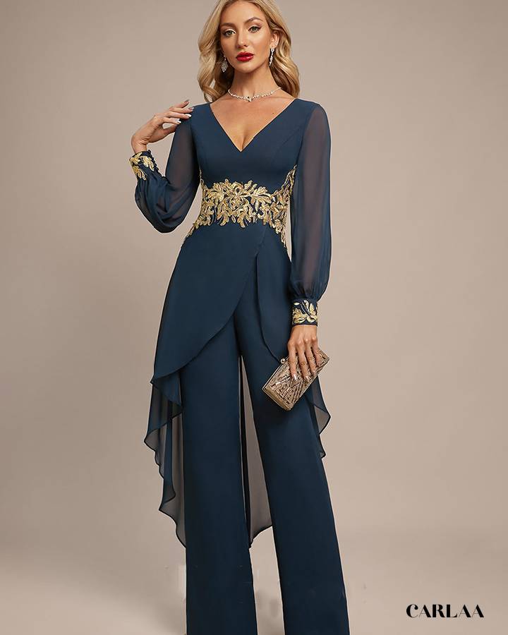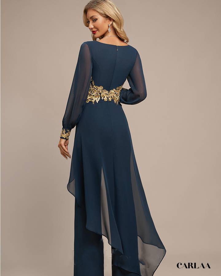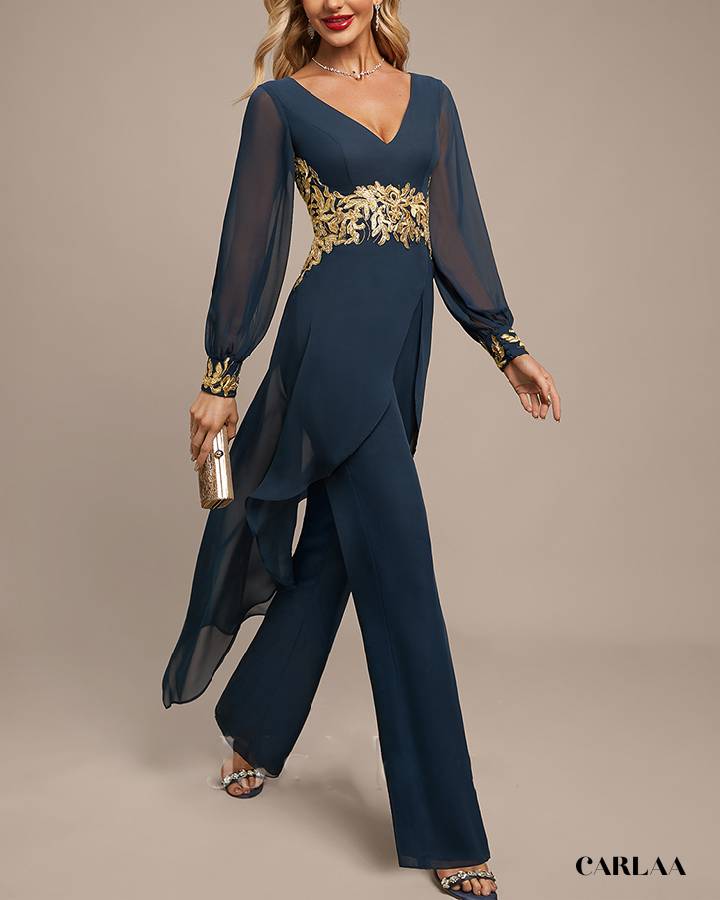 Das Design mit langen Chiffonärmeln und goldener Stickerei in der Taille betont die feminine Silhouette und sorgt für einen luxuriösen Look. Der fließende Stoff und die leicht asymmetrische Schleppe verleihen dem Outfit Bewegung und Anmut – ideal für festliche Anlässe, Galas oder elegante Abendveranstaltungen. Mit diesem eleganten Jumpsuit ziehst du garantiert alle Blicke auf dich.