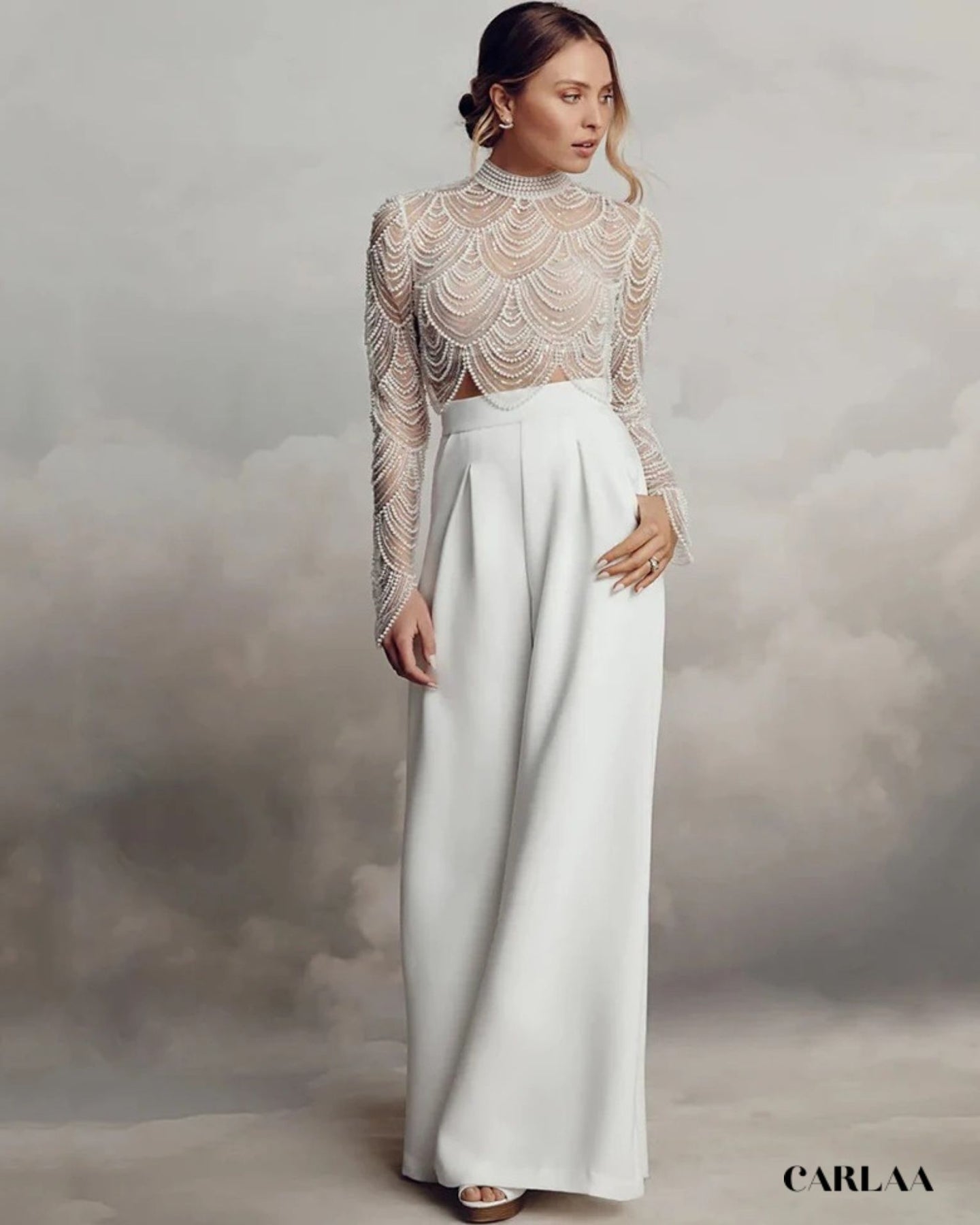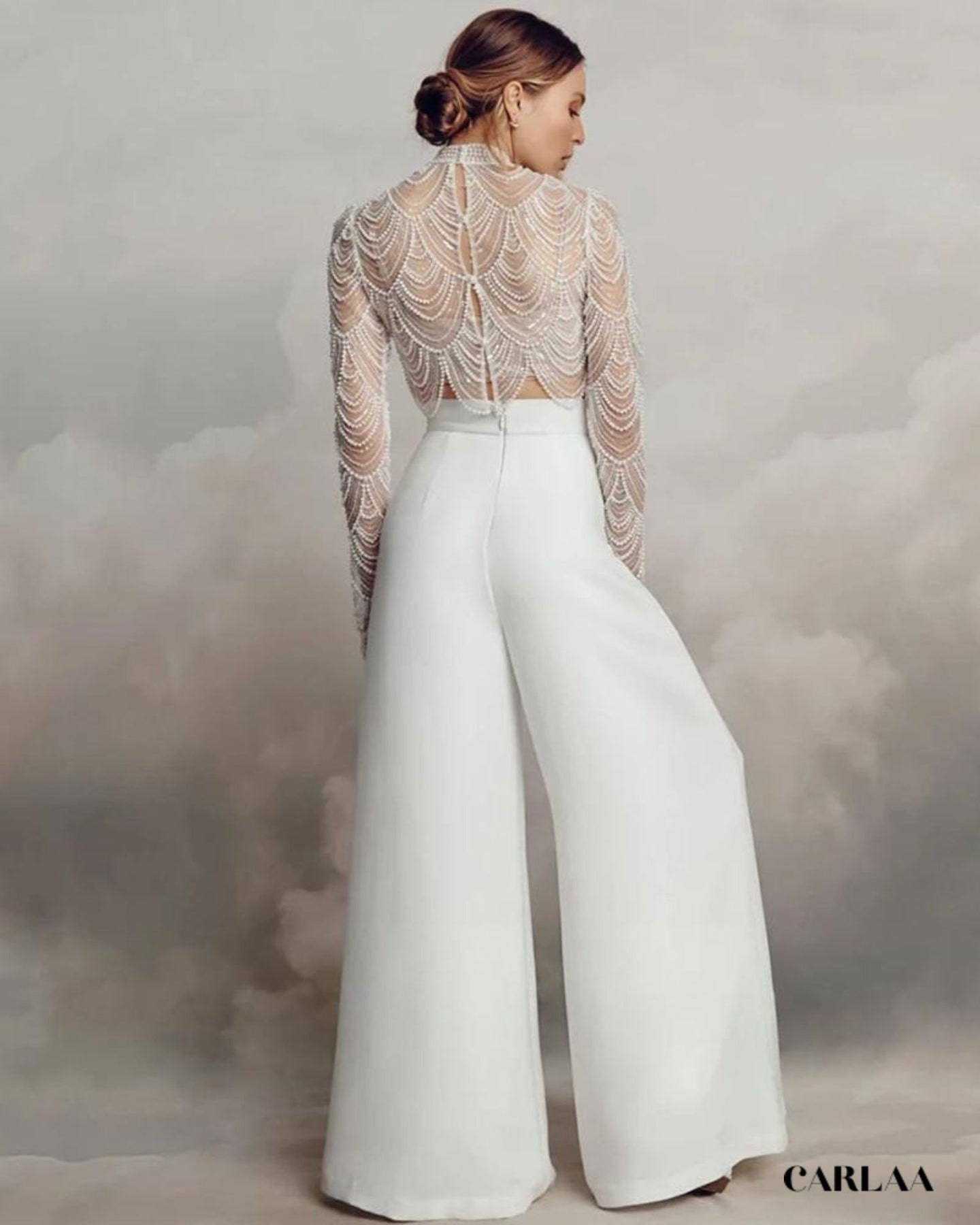 Das Oberteil aus feinem, transparentem Stoff ist kunstvoll mit schimmernden Perlen in geschwungenen Linien verziert – ein luxuriöses Detail, das subtilen Glamour verleiht. Der hochgeschnittene, fließende Hosenstil streckt die Silhouette und sorgt für eine anmutige, selbstbewusste Ausstrahlung. Dieser Look ist ideal für Bräute, die Minimalismus mit einem Hauch von Extravaganz lieben. Kombiniere ihn mit eleganten Heels und einem edlen Chignon, um deinen Auftritt beim Standesamt unvergesslich zu machen.