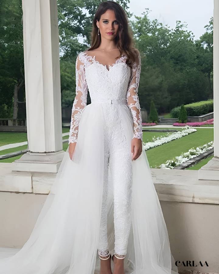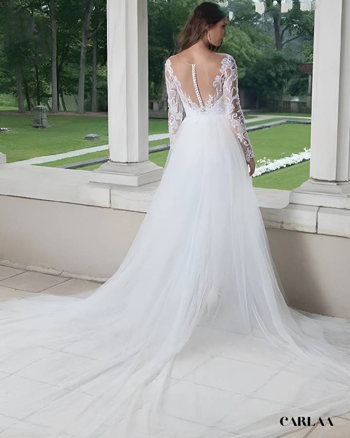 Das Design mit feiner Spitze, langen Ärmeln und einem tiefen Rückenausschnitt kombiniert feminine Raffinesse mit moderner Extravaganz. Der abnehmbare Tüll-Überrock sorgt für eine traumhafte Silhouette und verleiht dem Outfit die Dramatik eines Brautkleids. Perfekt für Bräute, die eine stilvolle Alternative zum klassischen Kleid suchen und ihren Auftritt unvergesslich machen möchten.