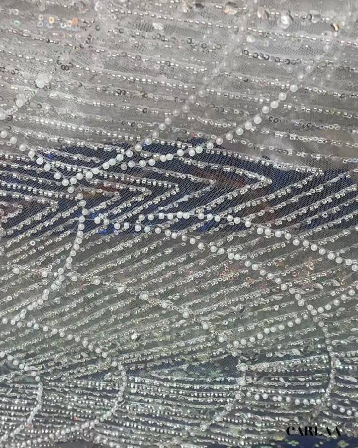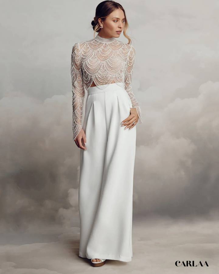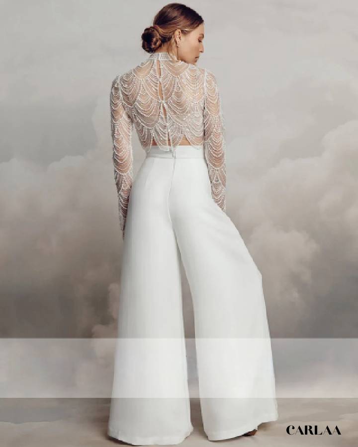 Das transparente Oberteil mit feinem Perlen- und Paillettenmuster verleiht Glamour und Raffinesse, während die weiten Hosenbeine für eine elegante Silhouette sorgen. Perfekt für standesamtliche Hochzeiten, luxuriöse Feiern oder Bräute, die ein außergewöhnliches Outfit an ihrem großen Tag tragen möchten.