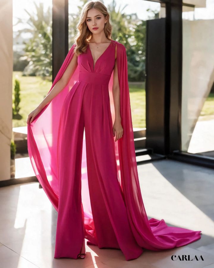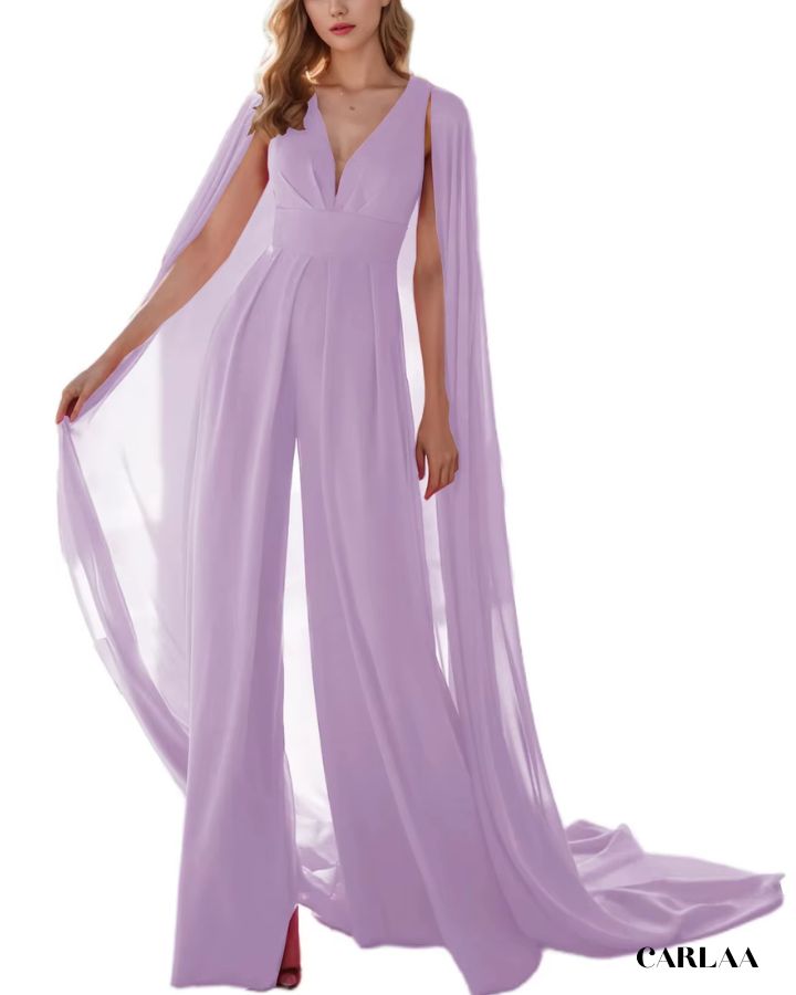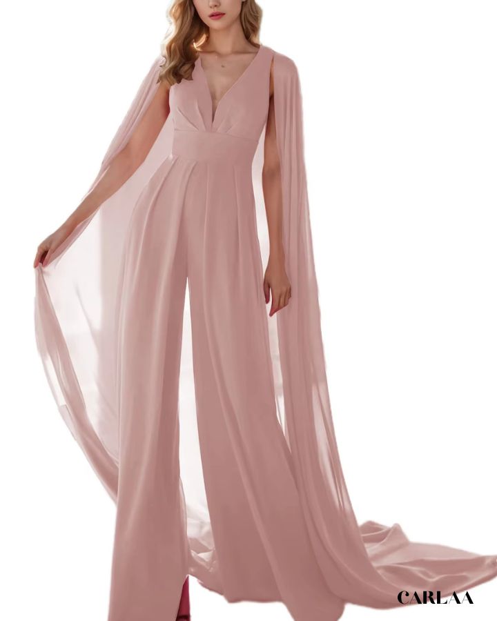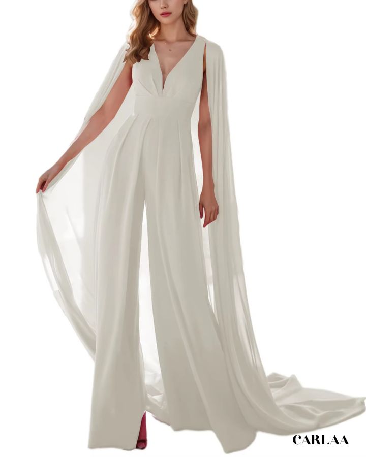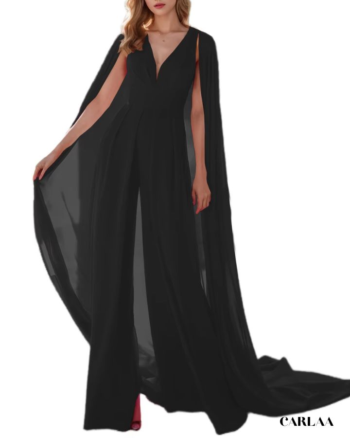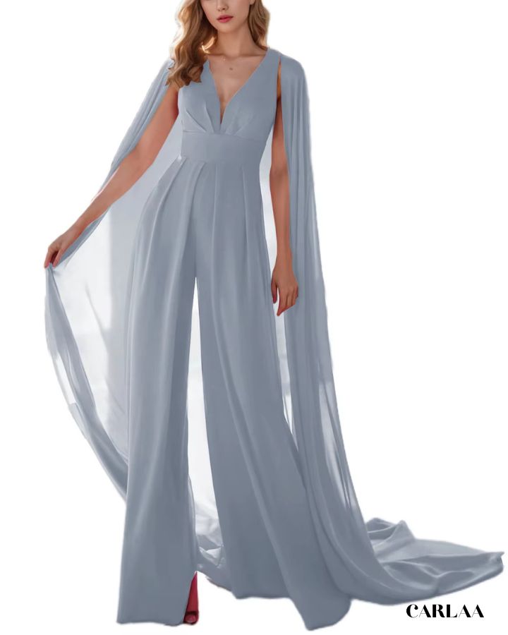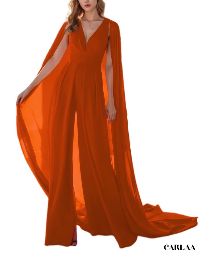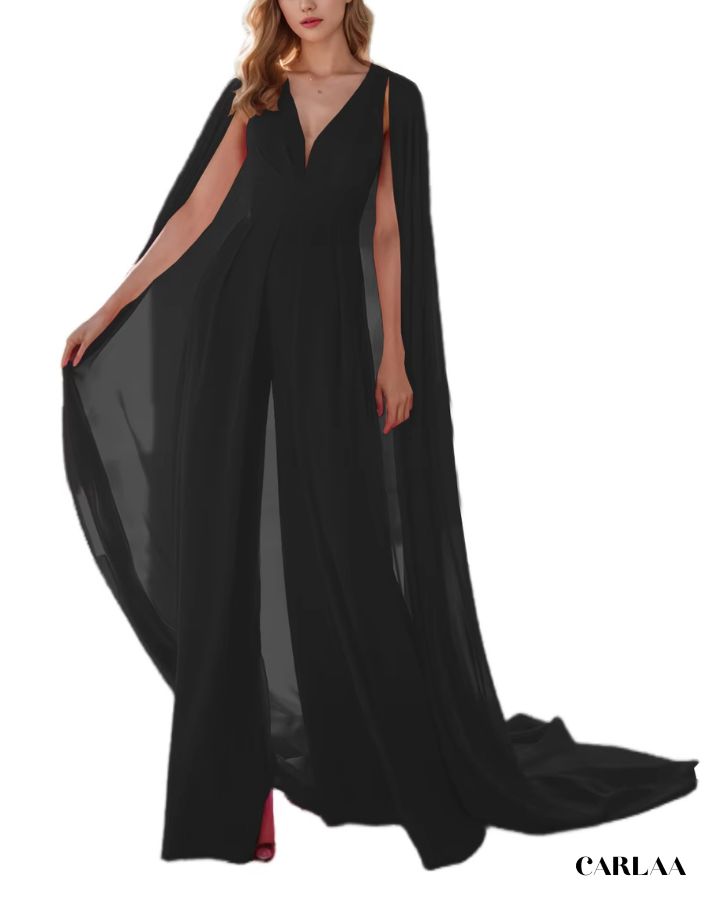 Der fließende Stoff und der dramatische Umhang verleihen dir eine majestätische Ausstrahlung, während der taillierte Schnitt deine Figur perfekt betont. Ideal für Hochzeiten, Abendevents oder festliche Anlässe, verbindet dieser Overall Komfort mit einem luxuriösen Look. Der tiefe V-Ausschnitt sorgt für einen femininen Touch, und das Cape bringt Bewegung und Glamour in jeden Schritt. Erhältlich in vielen Farben, damit du deinen persönlichen Stil perfekt unterstreichen kannst.