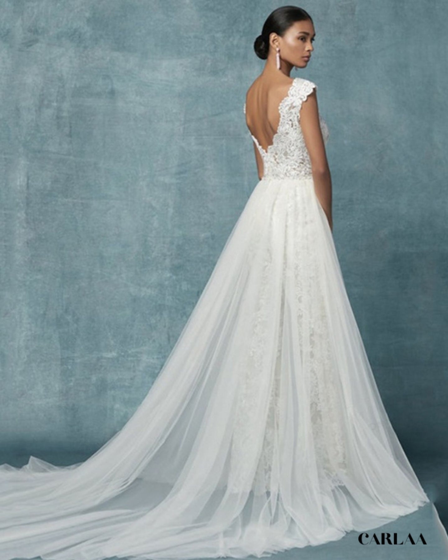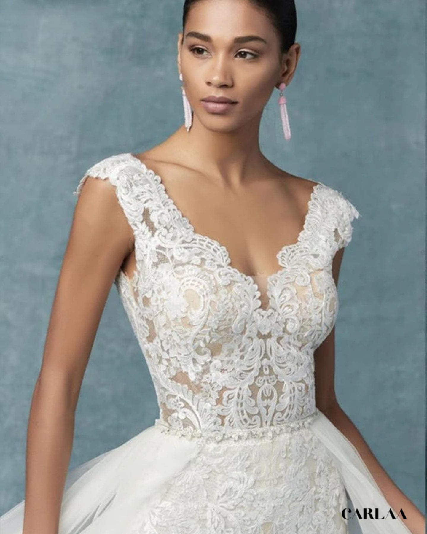 Ce jumpsuit en dentelle délicate incarne à la perfection l’équilibre entre romantisme et modernité. Sa coupe ajustée épouse les courbes avec grâce, tandis que le dos plongeant et le décolleté subtil apportent une touche sensuelle sans en faire trop. La dentelle florale, richement travaillée, ajoute une allure couture qui capte la lumière à chaque mouvement. Léger, fluide et incroyablement confortable, il se porte aussi bien pour une cérémonie au Standesamt que pour une réception élégante. Un choix audacieux et raffiné pour la mariée contemporaine qui veut briller autrement. 💍✨