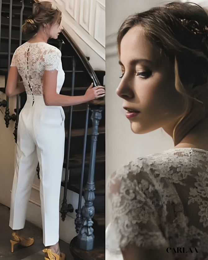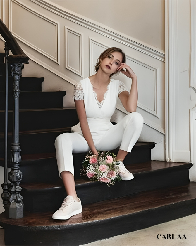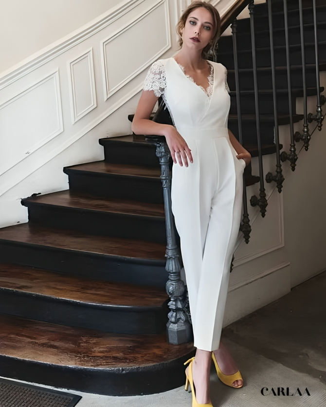 Dieser weiße Jumpsuit für das Standesamt ist die perfekte Wahl für Bräute, die sich eine elegante, moderne Alternative zum klassischen Brautkleid wünschen.