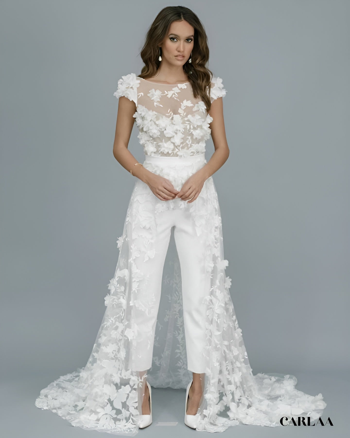 Diese außergewöhnliche Kreation kombiniert einen transparenten Body mit dreidimensionalen floralen Applikationen, die wie ein blühender Garten über deinen Körper tanzen und eine textile Poesie von atemberaubender Schönheit erschaffen. Die kurzen Ärmel aus zartem Tüll, komplett bedeckt mit handapplizierten Blüten, rahmen deine Schultern mit romantischer Raffinesse ein. Der figurbetonende Jumpsuit darunter bietet dir absolute Bewegungsfreiheit und modernen Komfort, während die transparente Übertunika mit ihrer bodenlangen Schleppe den zeremoniellen Glamour garantiert. Die Blütenapplikationen wurden strategisch platziert und verdichten sich an den Beinen zu einem opulenten floralen Muster, das in eine dramatische Schleppe übergeht.
