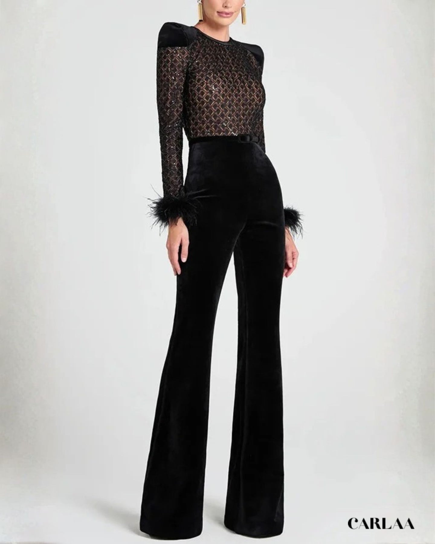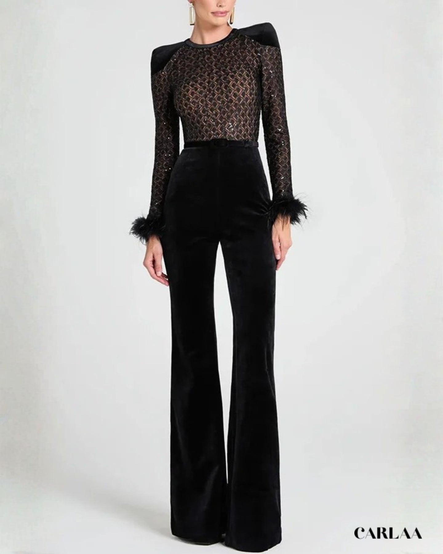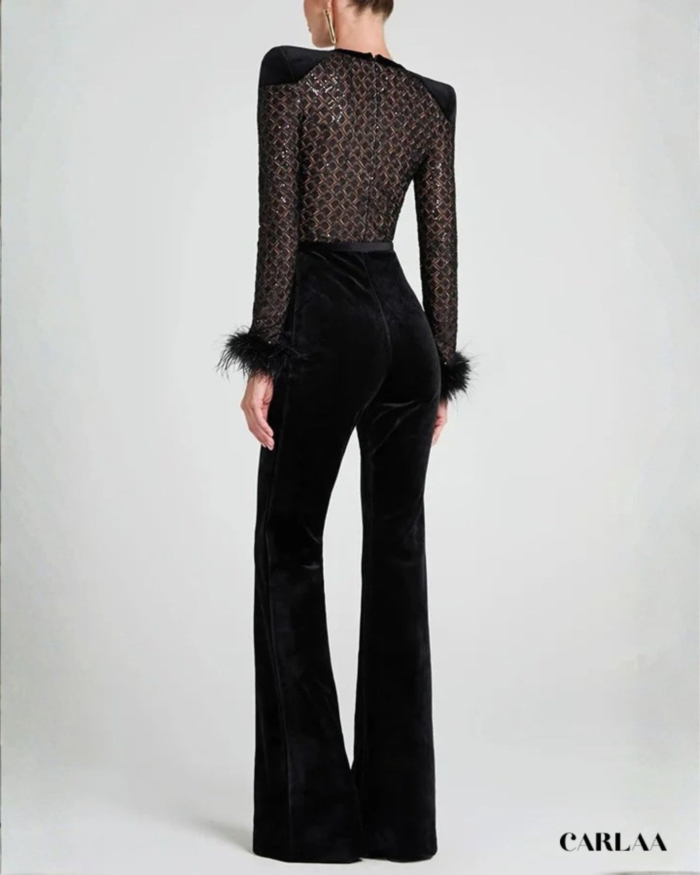 Découvre l’élégance audacieuse avec cet overall noir, une pièce qui allie sophistication et modernité à la perfection. Son haut transparent délicatement brodé sublime la silhouette, tandis que les manches longues ornées de plumes ajoutent une touche de glamour raffinée. La coupe ajustée et le pantalon évasé allongent la jambe pour une allure gracieuse et puissante à la fois. Que ce soit pour une soirée chic, un événement spécial ou une occasion où tu veux briller, cet ensemble te garantit une présence inoubliable. 💫