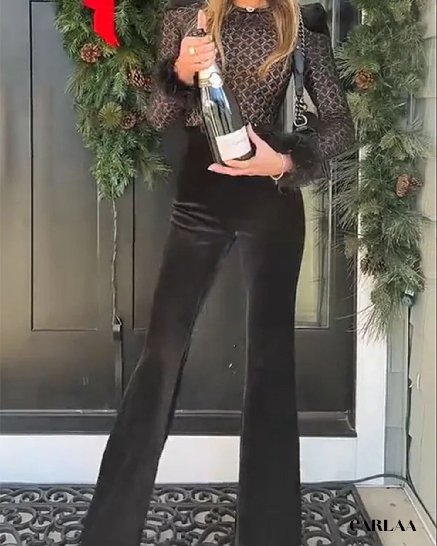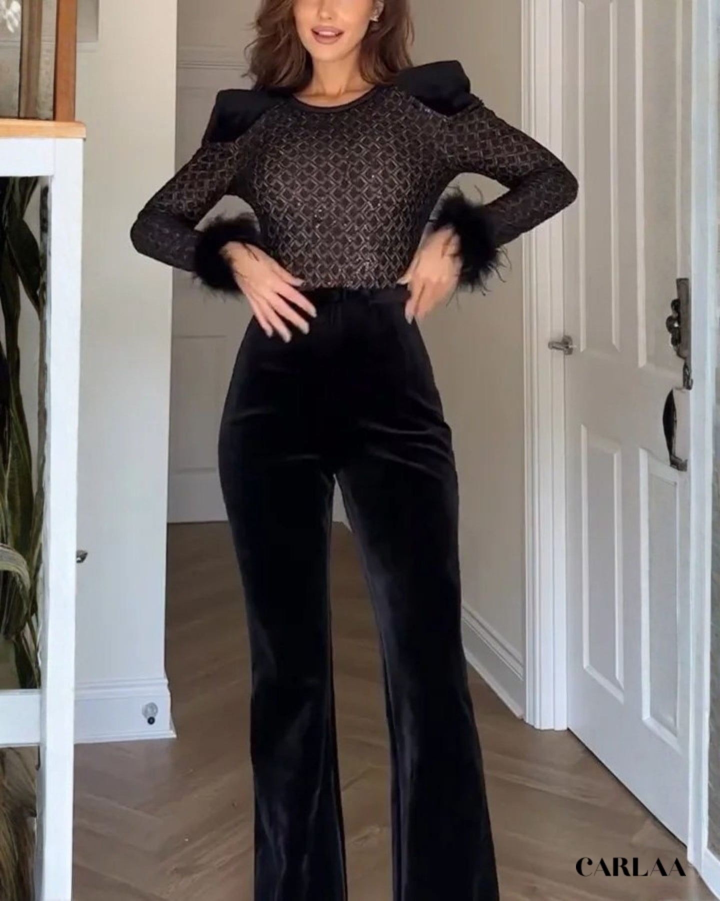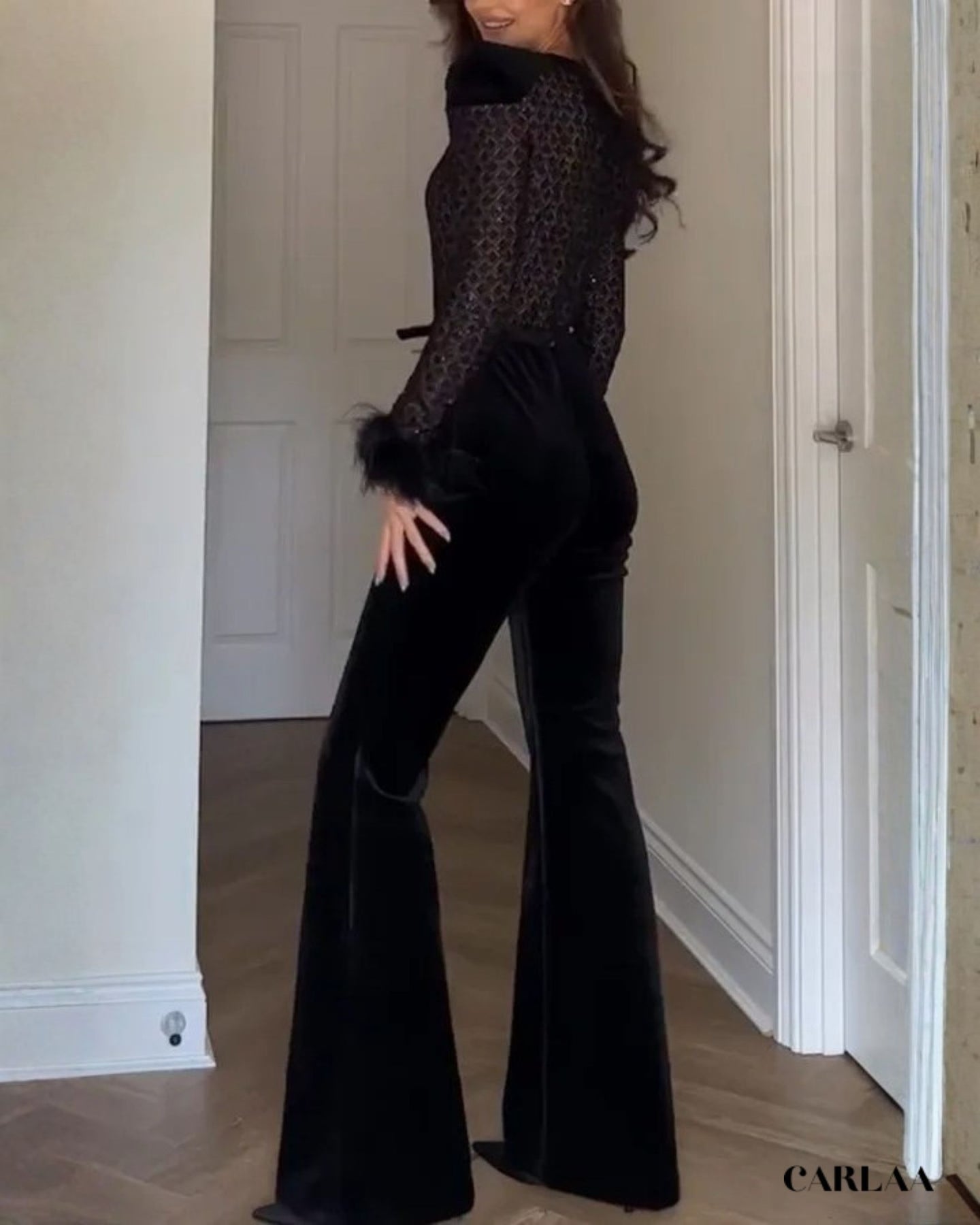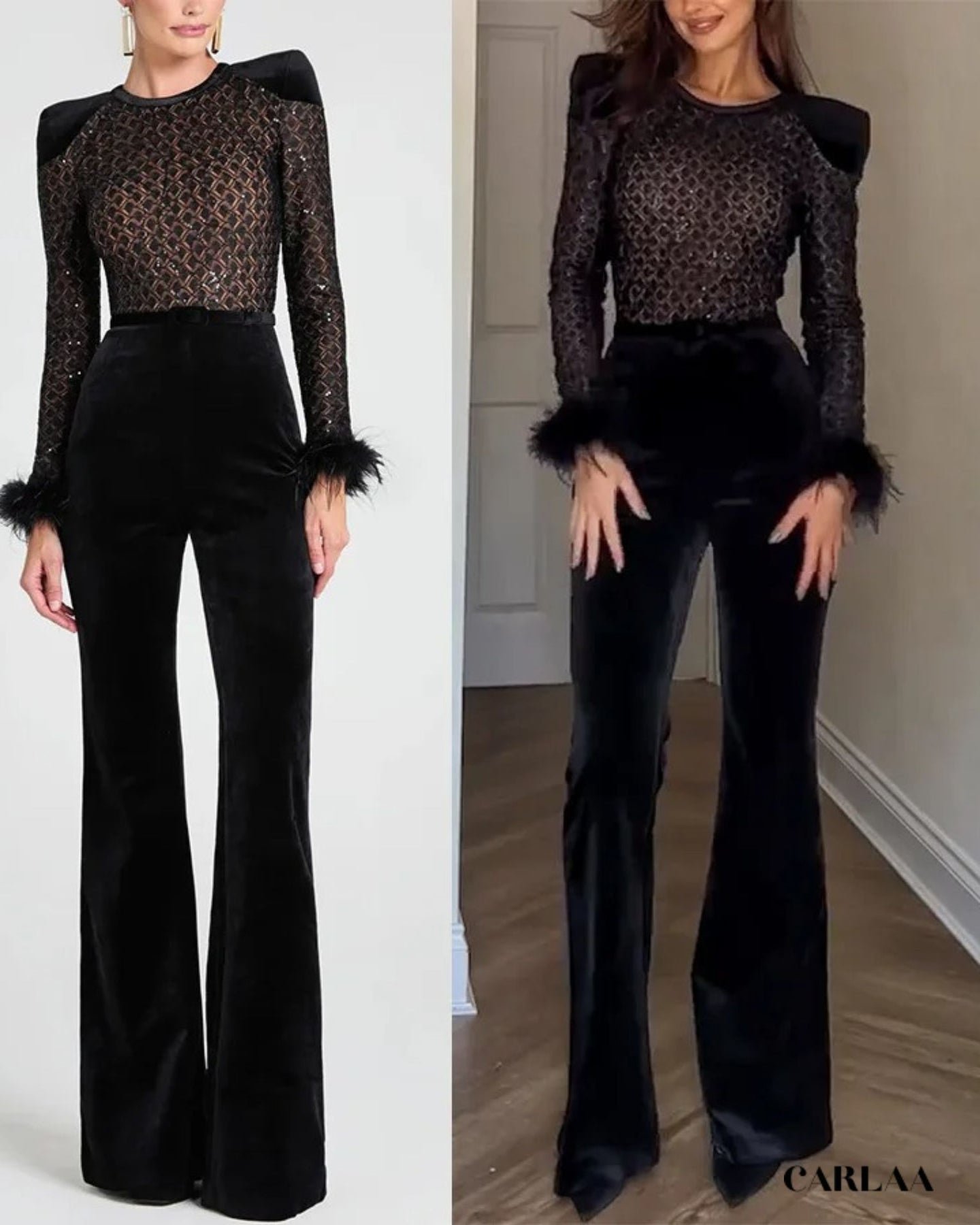 Découvre l’élégance audacieuse avec cet overall noir, une pièce qui allie sophistication et modernité à la perfection. Son haut transparent délicatement brodé sublime la silhouette, tandis que les manches longues ornées de plumes ajoutent une touche de glamour raffinée. La coupe ajustée et le pantalon évasé allongent la jambe pour une allure gracieuse et puissante à la fois. Que ce soit pour une soirée chic, un événement spécial ou une occasion où tu veux briller, cet ensemble te garantit une présence inoubliable. 💫