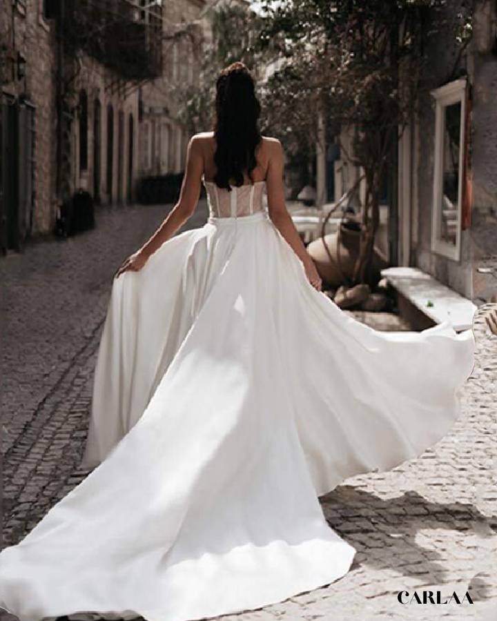 Dieser atemberaubende Jumpsuit kombiniert die Raffinesse eines Brautkleids mit der modernen Leichtigkeit eines Overalls. Das trägerlose Oberteil mit feinen Spitzen-Details betont dein Dekolleté, während die fließende Silhouette und die weiten Hosenbeine für einen glamourösen Auftritt sorgen. Ideal für standesamtliche Trauungen, elegante Feiern oder als zweites Braut-Outfit am Abend. Ein Hochzeits-Jumpsuit, der Komfort und Eleganz perfekt vereint und dich stilvoll strahlen lässt.